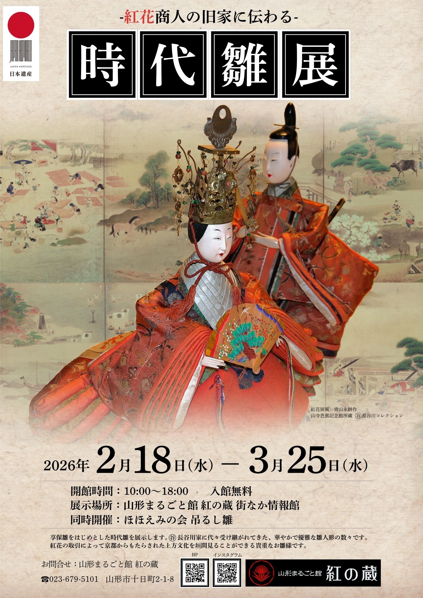 紅花の取引によって京都などからもたらされた 上方文化を垣間見ることが出来る貴重なお雛様です。