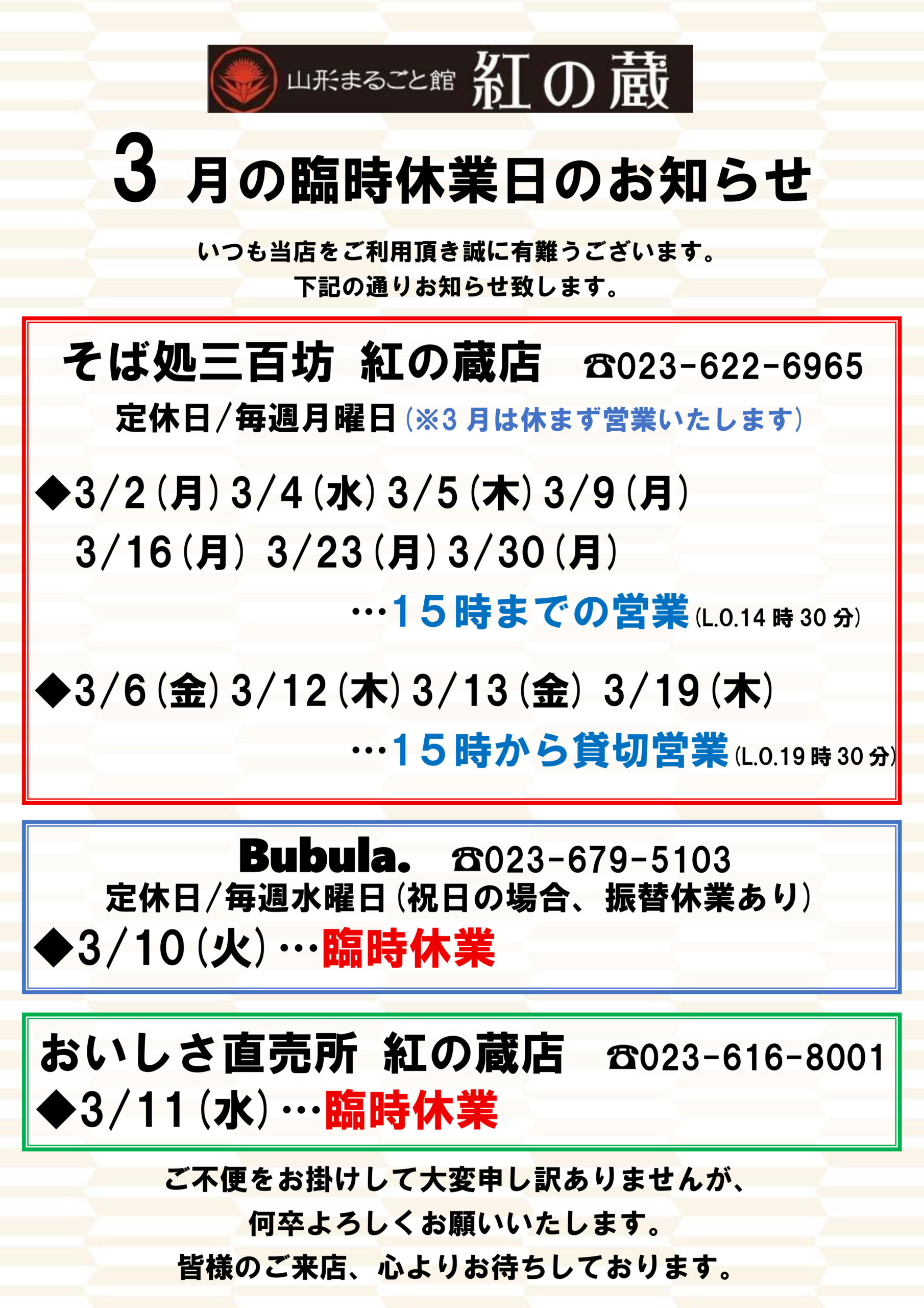 2026.02.28 3月の臨時休業のお知らせ 日頃より当店をご利用いただき、ありがとうございます。 上記の通り、お知らせ致します。 ご不便をお掛けして大変申し訳ありませんが何卒よろしくお願いいたします。 皆様のご来店、心よりお待ちしております。 Tweet Share RSS 2月の臨時休業のお知らせ